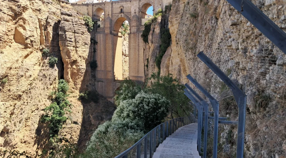 El Caminito del Tajo es la joya vertiginosa de Ronda, inspirada en el famoso Caminito del Rey pero adaptada al icónico desfiladero que divide la ciudad. Este sendero, conocido también como el Camino de los Molinos, serpentea por la base del Tajo a más de 100 metros de profundidad, ofreciendo una perspectiva única del Puente Nuevo y el río Guadalevín. Con unos 4 kilómetros de longitud, la ruta comienza cerca del Puente Árabe y permite llegar hasta los pies de la icónica estructura del siglo XVIII, rodeado de acantilados calizos y vegetación endémica.